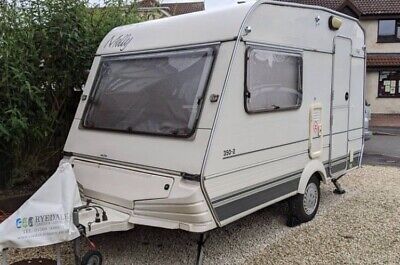 Well maintained very lightweight 2 berth caravan. Both tyres and a spare in great condition. Also comes with:12V leisure battery,25m electric hookup cable,Water and waste barrel,12V water pump,Fridge,2 gas bottles,Portaloo + Basin area,Winter cover,Heavy duty hitchlock,Wing mirror attachments (for towing).Wiring has also recently been updated to include 12v usb phone charger.Internal length 3.5mTotal length 4.75mCan deliver locally for a fee (please ask before purchase).Any questions please ask.