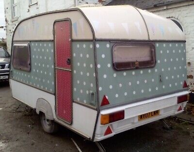 Open to offers,need gone before Christmas ideally,so happy to sell for a bargain price.2/3 berth lightweight caravan,530kg,can be towed by any car.Nicely decorated retro interior,comes with full original awning and all original paperwork from new.There is no damp,the front wood has been replaced and reboarded.The seating area folds down to a large king-size bed,which can easily sleep 3.There is a small bathroom with porta potti and sink,Full gas oven,hob and sink.Plenty of storage space in wardrobe,under seats and cupboards.A transformer has been fitted,so electrics all work from being plugged into a hook up or house,no leisure battery needed to run it. General age related wear,but overall a lovely van for the price.There is no fridge,but place for a small one to go in.Any questions please feel free to ask,delivery may be available for the cost of Fuel,dependent on location and viewing very welcome.It tows brilliantly,all towing lights work,and breaks and tyres are good