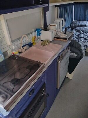 We are the 3rd owners as far as we know the previous owner has ripped shower out we haven’t put one back in we’ve owned it a year and it’s not needed now it has fixed bunk beds , sofa turns into a double bed , has toilet , sink all kitchen facilities it also has half a bottle of gas and all hook up leads needed
