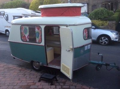 1974 Erica puck it’s not the smooth skinned version for those in the know.Warning- only buy if you like everyone tooting and waving when you’re towing or hanging out ot their car windows to get piccys.I’ve owned this for about 5 years and lots of fun camping around the Uk. We are non smokers and have no pets so very clean inside.It’s a solid little caravan which has been personalised. The two seats convert into a bed and its wider than a double and very very confortable Full respray – VW Turkish green and off white – approx 5yr ago – does have a few scratches and marks consumerate with regular useOriginal interior – used but very serviceable except table with is a skim board Interior recovered in beige vinyl and green piping Paul smith style LinoIkea fabrics for the curtains Brand new pop top fitted only 4 weeks ago Electric hook – fully working for lights and sockets Leisure battery for water pump – you could wire lights up to this as week as the original 12v light is still there Wind down legs as well as the original spring loaded legs Towing electrics all work 2 new tyres – less than 500 miles on them plus a spare The awning in the pictures is included and matches the caravan really well it’s approx – 8ft by 6ft and is fully waterproof It’s is really light and can be connected by lifting ontp the tow hitch or use the jockey wheel. I’ve towed it behind my VW 1600 camper since…