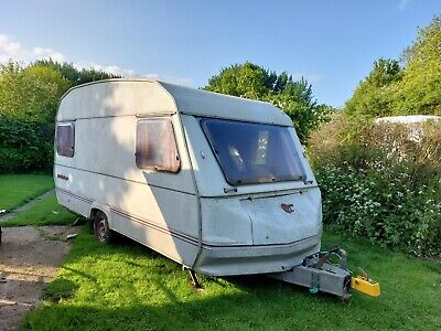 Sprite Musketeer SXL 4/5 Birth Caravan (spares or repair)1989 model240v hook-upCold water with sink & wash basinGas heaterFridge with freezer compartment 12v power supply We have owned this caravan for 23 years it has been parked for the last 15 or so years and is unfortunately looking a bit worse for wear now (see photos).The chassis is solid (galvanised steel) so there is no rust. I have replaced the tyres recently with a couple of part-worn ones. These are a matching pair with approximately 6mm of tread remaining.Unfortunately the exterior wall of the bathroom has got damp due to a leak (now sealed) which has caused the wall covering to rip and fall away from the plywood. A strip of carpet has been removed due to paint spillage (it spent a portion of time as a storage shed) and has some damage to the inside of the door where a naughty dog wanted to escape!Recently we have been using it for accommodation while visiting my mother-in-law (parked at her house).The gas heater works well, as does the fridge/freezer! Beds are comfortable too.Would be an ideal source of parts for a camper conversion or site office, additional storage, or could be fixed up by a talented individual. Please only bid…