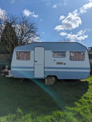 This is a vintage Sprite caravan that can comfortably accommodate up to four people. There is a cot / bed guard so perfect for a young family or this can be easily be removed back to the double bed. Two double beds in total.Original table that goes between the sofas when one of the beds is not in use.It’s blue and white exterior gives it a unique charm. It is beautifully decorated inside with bunting and little touches which makes it extra special. The kitchen has an induction hob, sink, original fridge and microwave all in working order with over head storage cupboards and one below the microwave.No toilet as this has been removed. Two large storage cupboards.All electrics work. Original glass windows. Split stable style door. Front lockable storage box. Road worthy and has been used a couple of times each year.
